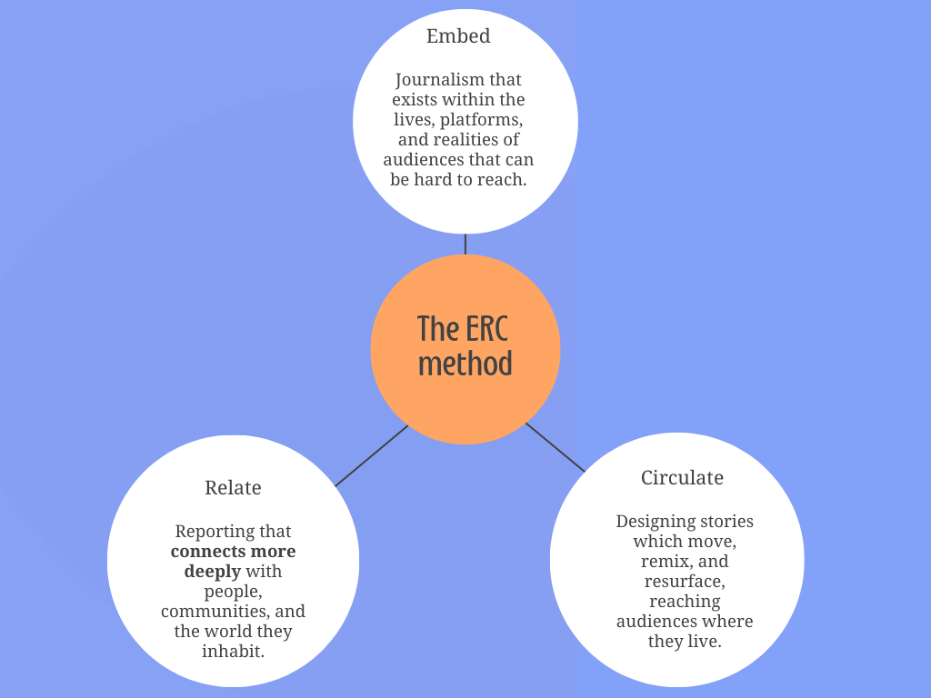 In practice: Reporting that starts from people’s lived experience, builds trust through transparency and proximity, and follows stories as they circulate. Basically, making it something people can understand more deeply. After many conversations with editors about connecting with news-avoidant or hard-to-reach audiences, I realised there was a need for clearer thinking on how to approach news in a busy, social media-driven world. That’s why I developed the ERC Method - a framework for journalism that embeds stories in people’s lives, makes them relatable, and follows how they circulate. It’s designed to build trust, relevance, and connection with audiences who are often overlooked.